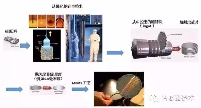 采用以硅为主的材料,电气性能优良,硅材料的强度、硬度和杨氏模量与铁相当,密度与铝类似,热传导率接近钼和钨。若单个MEMS传感器芯片面积为5 mm x 5 mm,则一个8英寸(直径20厘米)硅片(wafer)可切割出约1000个MEMS传感器芯片,分摊到每个芯片的成本则可大幅度降低。