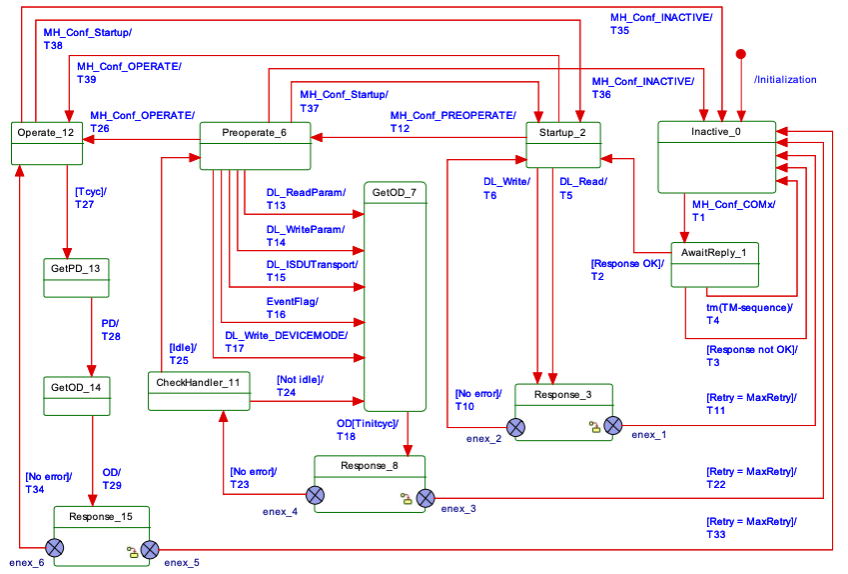 从Idle_1到GetMessage_2,当物理层有中断,接收到一个报文后,触发PL_Transfer事件,在OPERATE状态下动"MaxUARTframeTime"和"MaxCycleTime"定时器。