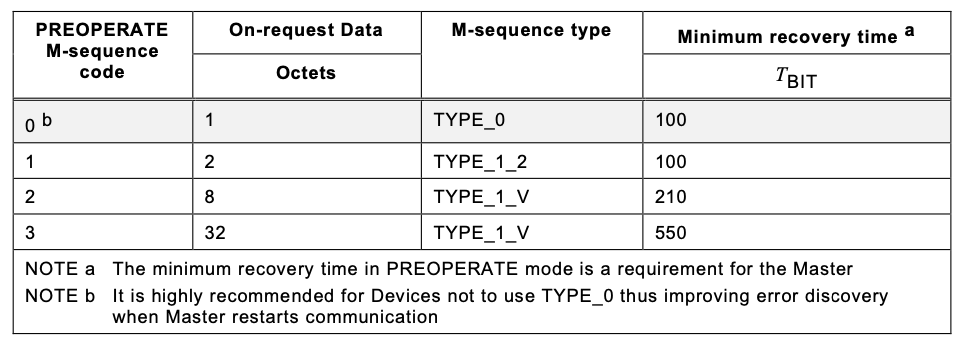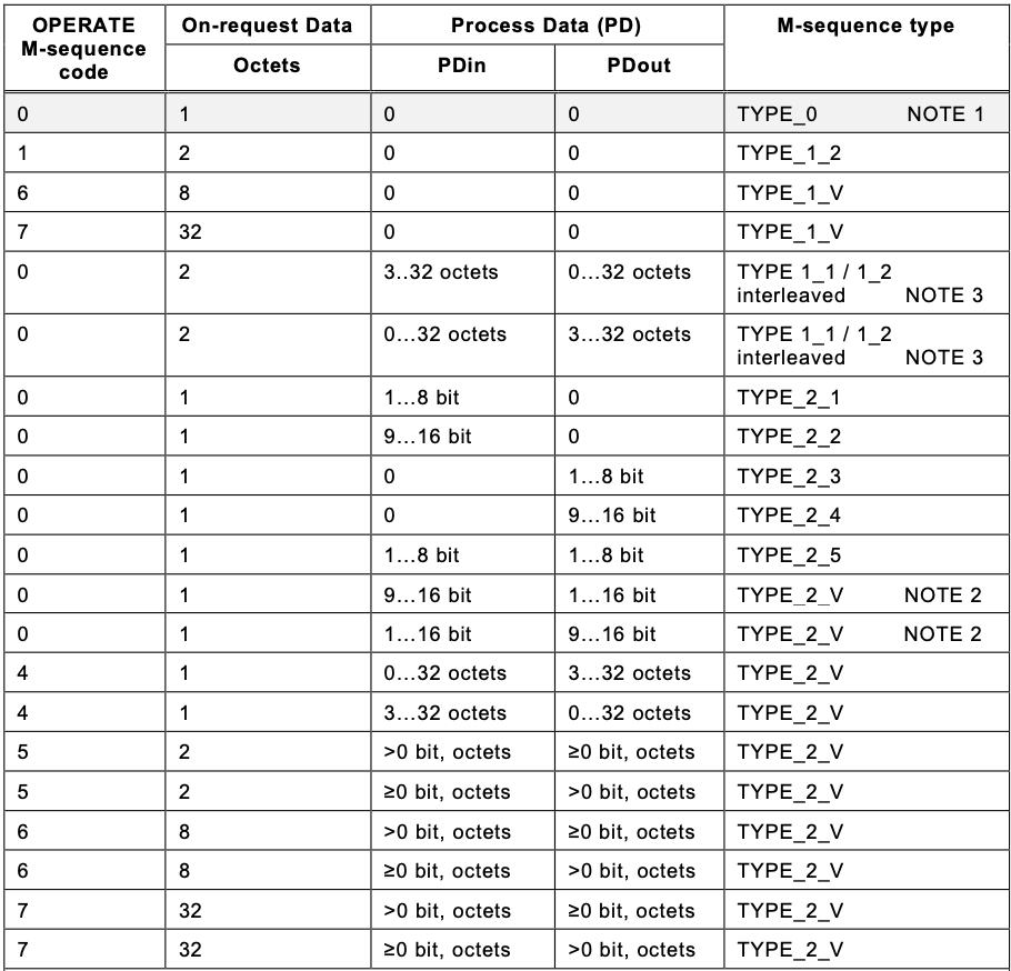 M-Sequence code就是对他的编码,用于在IO-Link报文中进行传输,可以看到PREOPERATE模式下有4个code可以用。