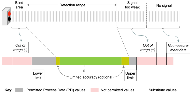 规范中详细举例,一个测量型传感器,它具备盲区、检测区、信号减弱区、无信号区这四大部分,如下图所示: