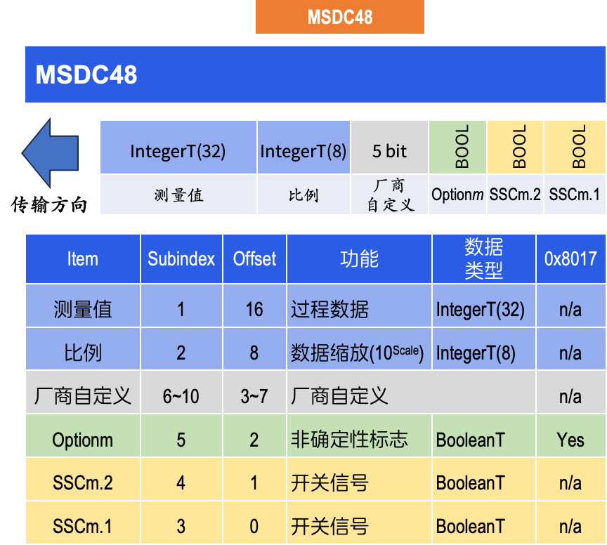 在MDC数据类型基础上,增加了传感器在某个阈值的开关量(SSC)就是MSDC的数据类型,其全称为Measurement and Switching Data Channel,其体现了Switching的功能,结构如下: