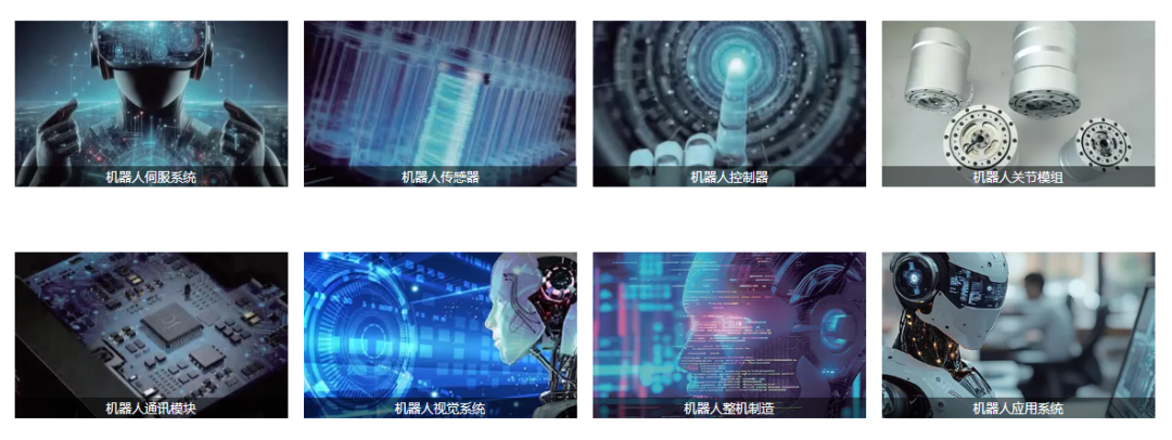 各类人形机器人、情感交互机器人、外骨骼机器人、仿宠物机器人、关键零 部件(包括伺服系统、传感器、减速器、控制器、关节模组、机器视觉系统、电池与电源管理系统、通信 模块以及计算平台与操作系统等)、系统集成等产业链与应用服务。